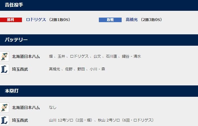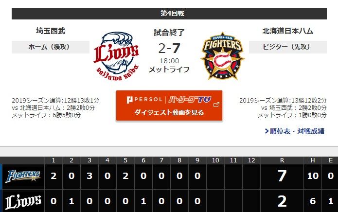 2019.5/1-試合結果【西武×日本ハム】(メットライフドーム)は2-7で西武が負け・・・先発高橋光成が2回途中5失点の炎上。。。山川と秋山にホームランが出るが令和初戦は勝てず。。