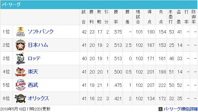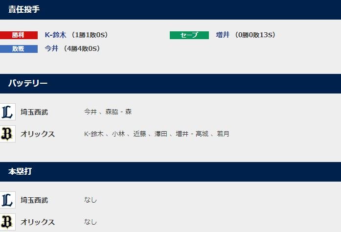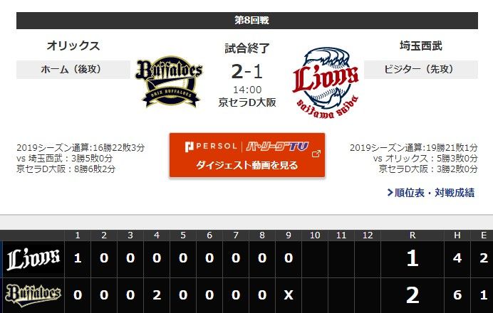 2019.5/18-試合結果【西武×オリックス】(京セラドーム大阪)は1-2で西武が負け・・・森が初回に先制、先発今井が7回2失点の粘りの投球をするが逆転できず。。。