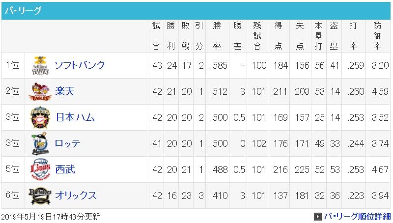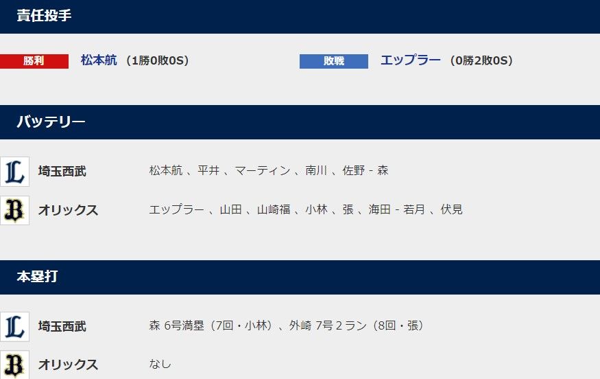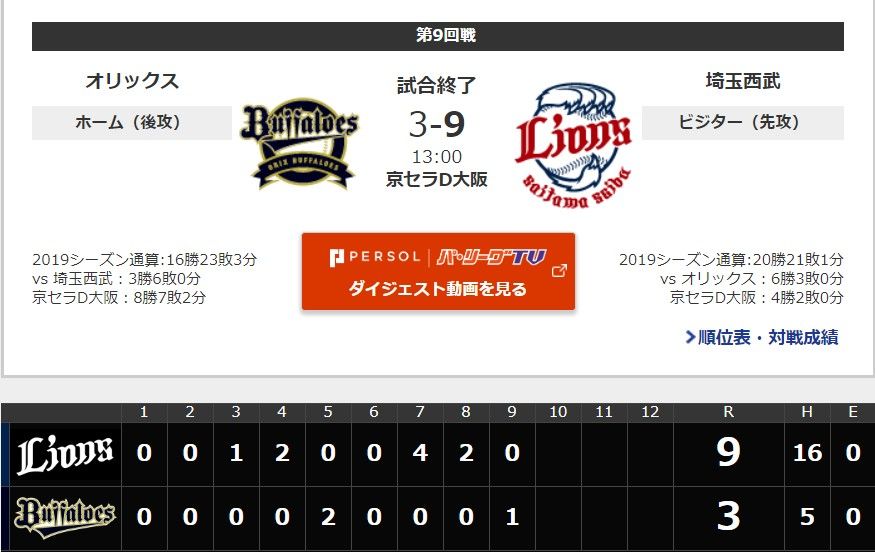 2019.5/19-試合結果【西武×オリックス】(京セラドーム大阪)は9-3で西武が勝ち!!森、外崎がホームラン!!プロ初登板で初先発の松本がプロ初勝利!!