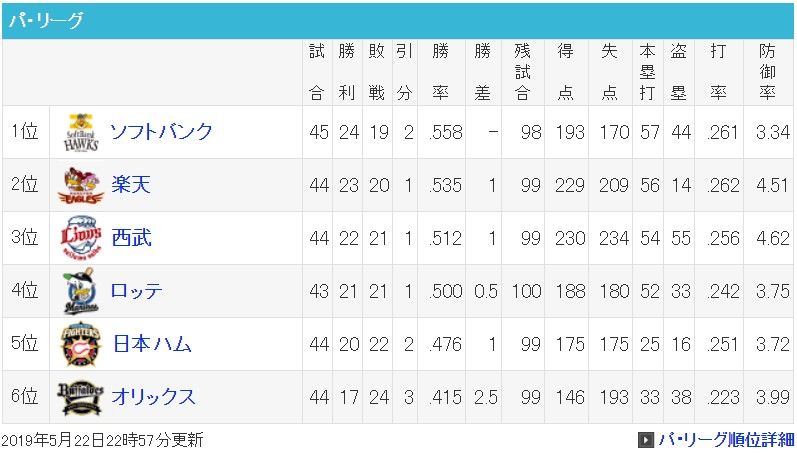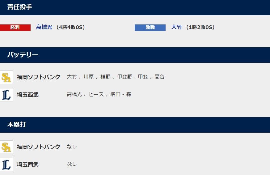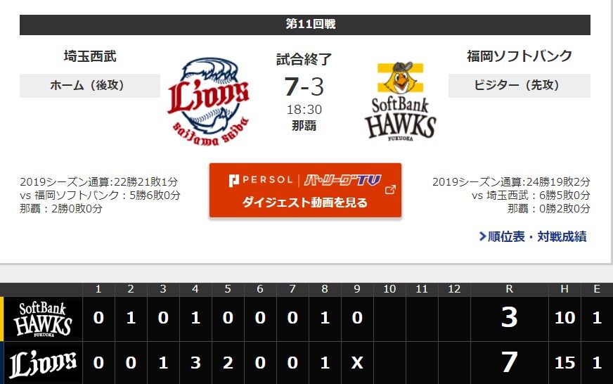 2019.5/22-試合結果【西武×ソフトバンク】(那覇)は7-3で西武が勝ち!!先発の高橋光成が7回2失点の粘りの投球で4勝目!!西武打線も15安打7得点と爆発!!
