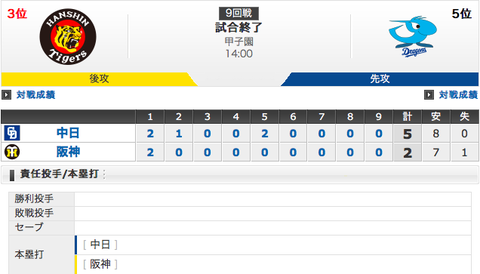 【試合結果】中日 5-2 阪神 連勝で連続カード負け越し脱出!清水5回2失点でプロ初先発初勝利!!!