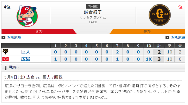 広島が今季3度目のサヨナラ勝ちで3連勝。十回、2死二塁でバティスタが左翼線へ劇的な一打を放った。チーム一丸で3カードぶりの勝ち越しを決め、カープファンで埋まったマツダスタジアムはお祭り騒ぎとなった。(全文はリンク先)