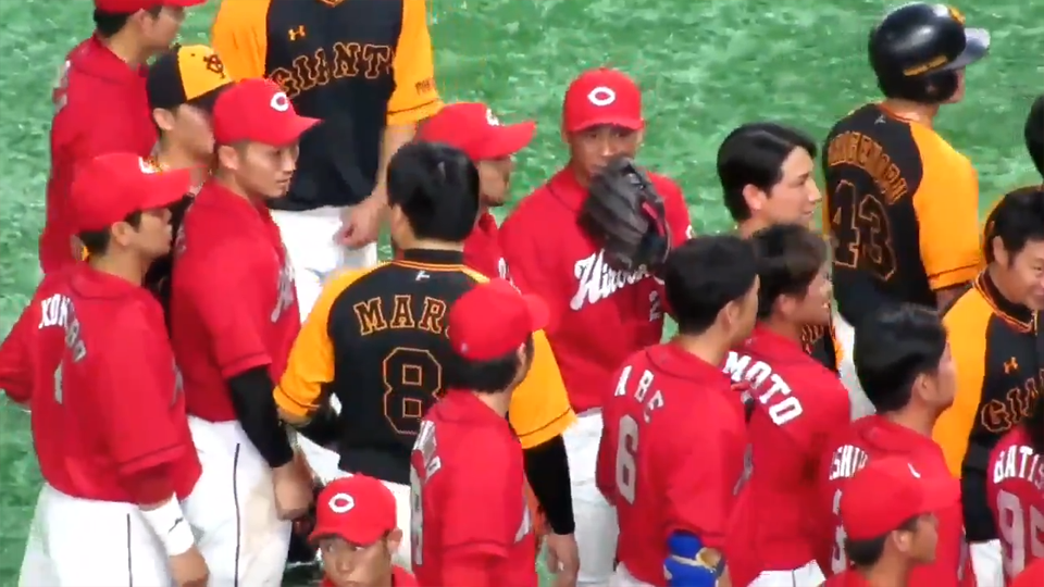 ■カープ・一岡竜司が巨人・中島裕之に危険球退場→乱闘寸前→鈴木誠也、野間峻祥、菊池涼介、田中広輔らが乱闘してない巨人丸を何故か止めに行く→鈴木誠也は丸に抱きつく(触りたいだけ)