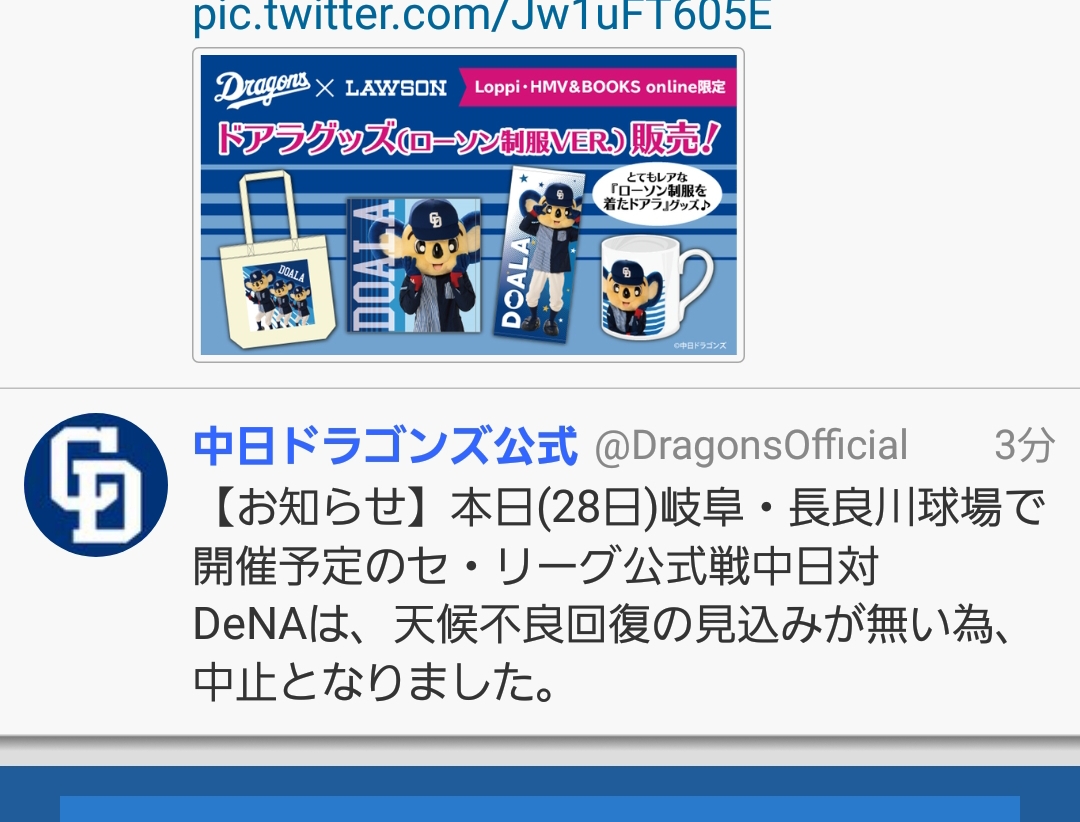 【お知らせ】本日(28日)岐阜・長良川球場で開催予定のセ・リーグ公式戦中日対DeNAは、天候不良回復の見込みが無い為、中止となりました。 — 中日ドラゴンズ公式 (@DragonsOfficial) 2019年5月28日