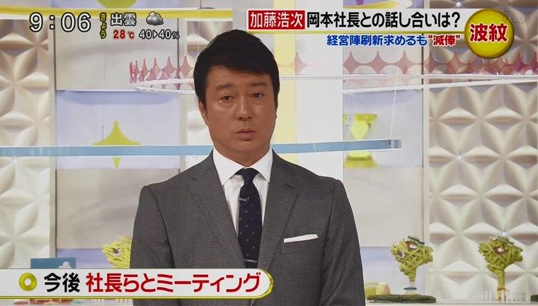 加藤は前日22日の放送で、大崎洋会長と岡本社長のツートップ体制について「若手は怖がっている。みんな我慢してきた」と風通しの悪さがあったと断罪。上層部刷新を求め、「この経営陣が変わらないなら俺は辞める」と退社も辞さない姿勢を示しが、岡本社長は自身の処分については「50%の減俸を1年間続ける」として辞任を否定し、「まずは自分が変わらなければならない」としていた。