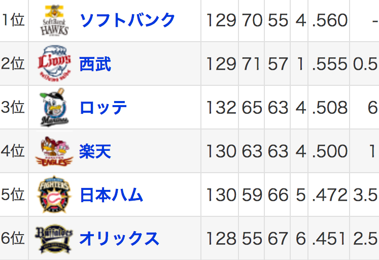 ロッテ06-05 .511 楽天09-04 .518 ハム13-00 .522