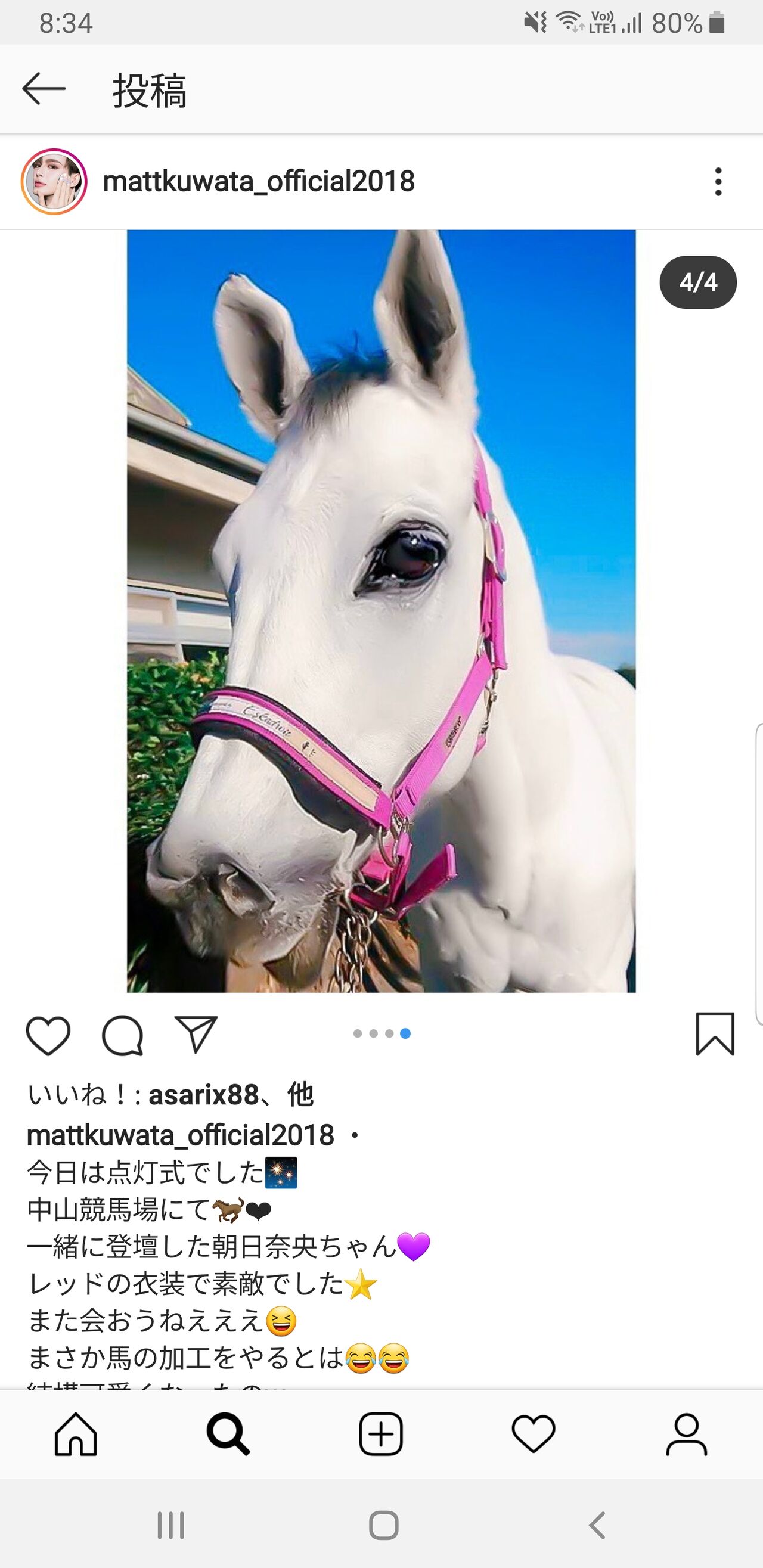 この投稿をInstagramで見る ・ 今日は点灯式でした✨ 中山競馬場にて🐎❤︎ 一緒に登壇した朝日奈央ちゃん💜 レッドの衣装で素敵でした⭐️ また会おうねえええ😆 まさか馬の加工をやるとは😂😂 結構可愛くなったのw みんなもイルミネーション見に行ってね💕 #中山競馬場 #イルミネーション #朝日奈央ちゃんにも魔法を💞 #まさか馬の加工のオファーがくるとはw Matt様(@mattkuwata_official2018)がシェアした投稿 - 2019年11月月24日午前6時26分PST