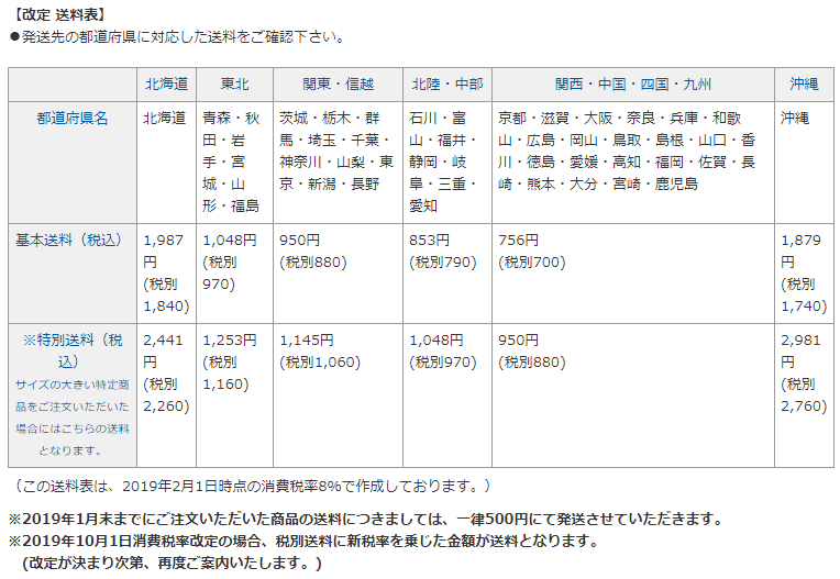 弊社にて商品の配送を委託しております、ヤマト運輸(株)より送料値上げの要請を受けまして2019年2月1日(金)のご注文より、下表のように商品の送料を地域毎に改定させていただきます。