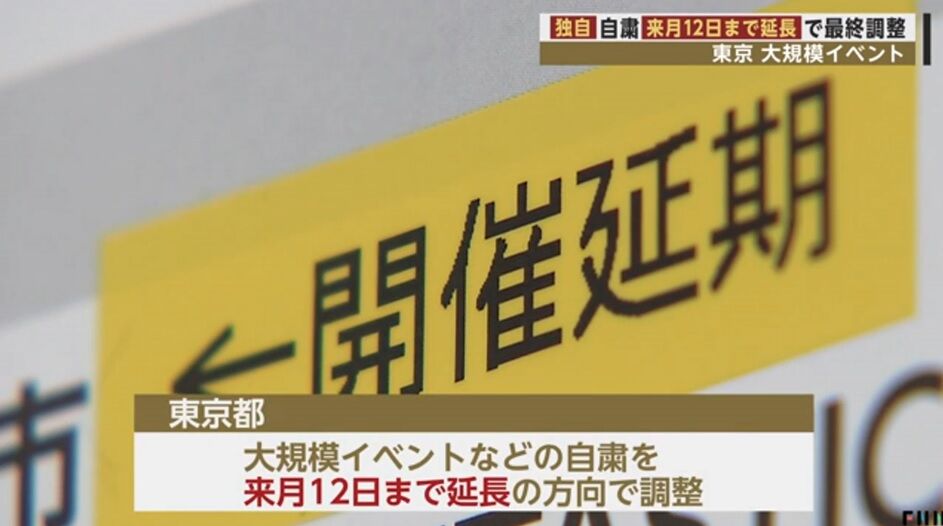 新型コロナウイルスの感染者を抑制するため、東京都が、大規模イベントなどの自粛を、4月12日まで延長する方向で最終調整していることがわかった。