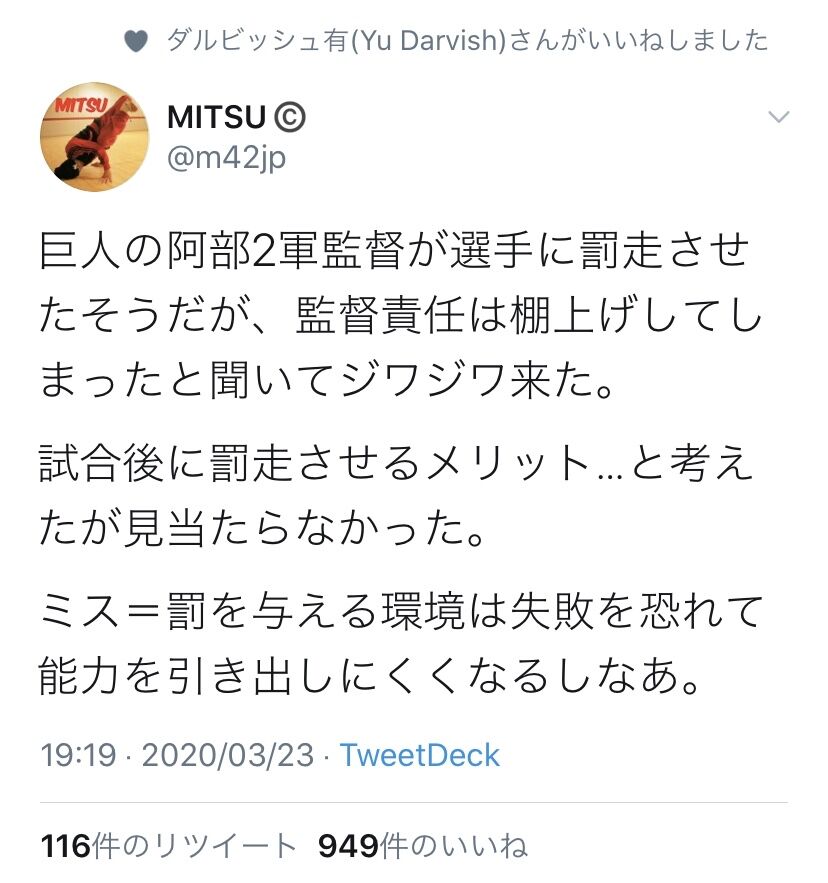 ダルビッシュさん『阿部二軍監督が選手には罰走させて自分の監督責任は棚上げでジワジワ来た』というツイートにいいねする