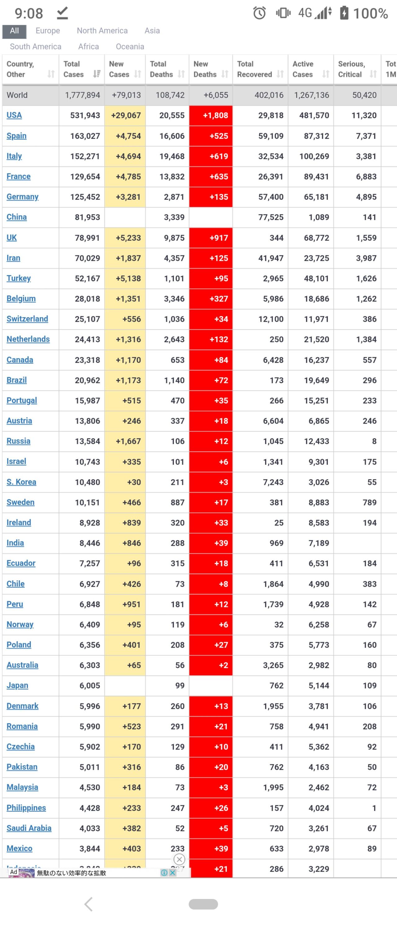 米国陽性531,943(世界1位)死者20,555(世界1位)