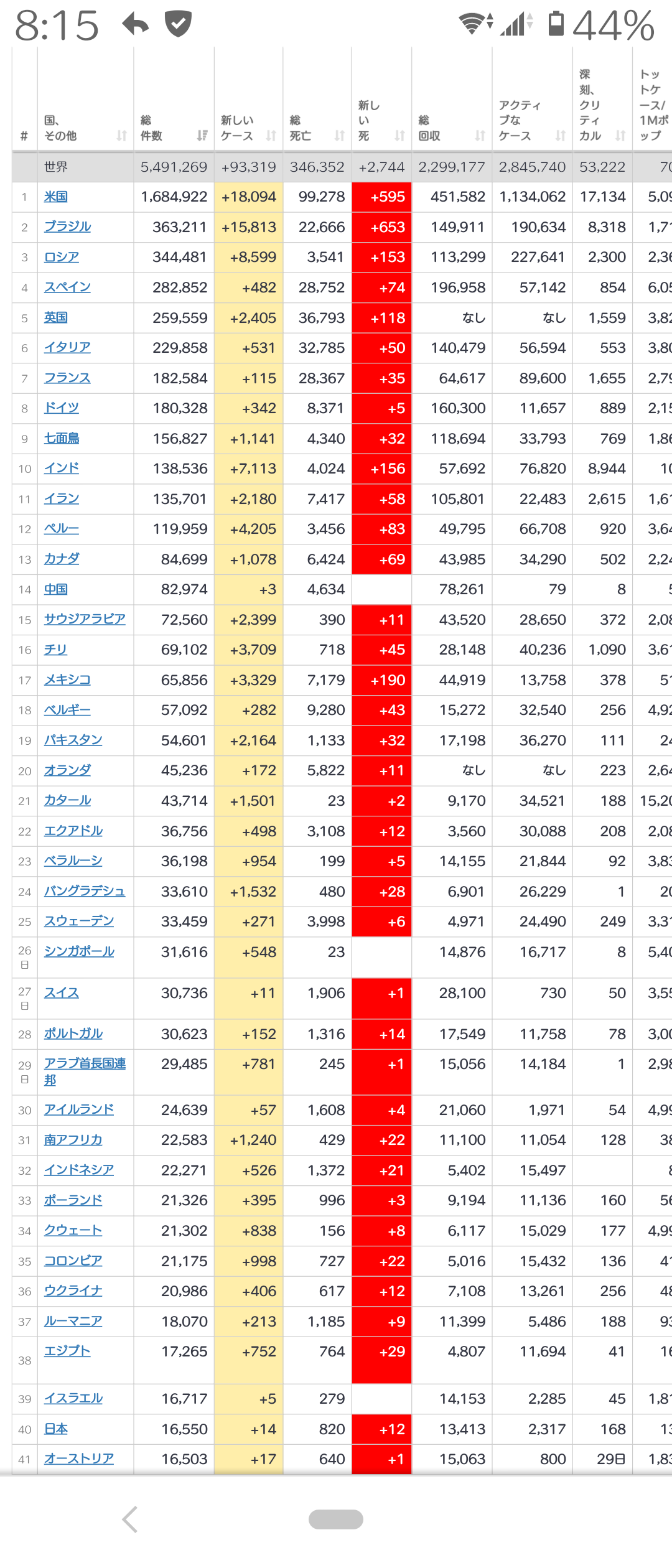 【新型コロナ】米国+18094 ブラジル+15813 ロシア+8599 インド+7113