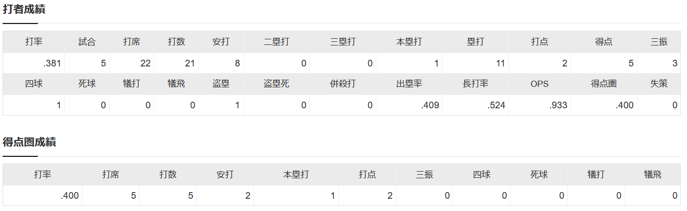堂林翔太.381 1本2打点出塁率.409 OPS.933