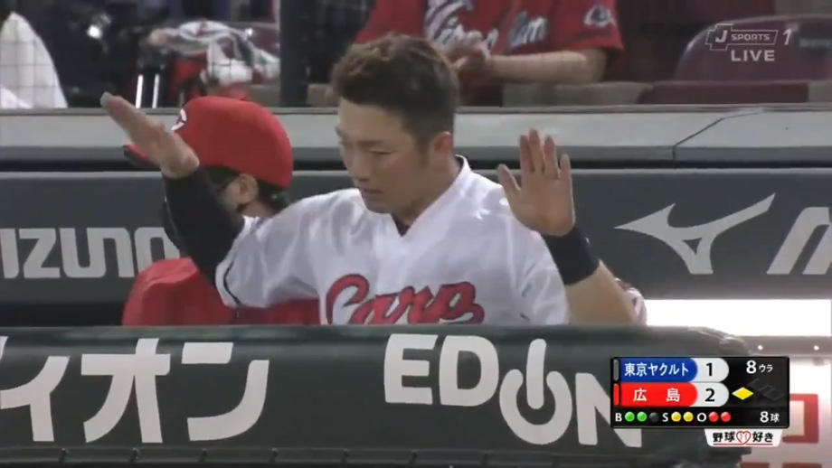 ■ベンチで『ドラムを叩くような動き』でチームを鼓舞する鈴木誠也